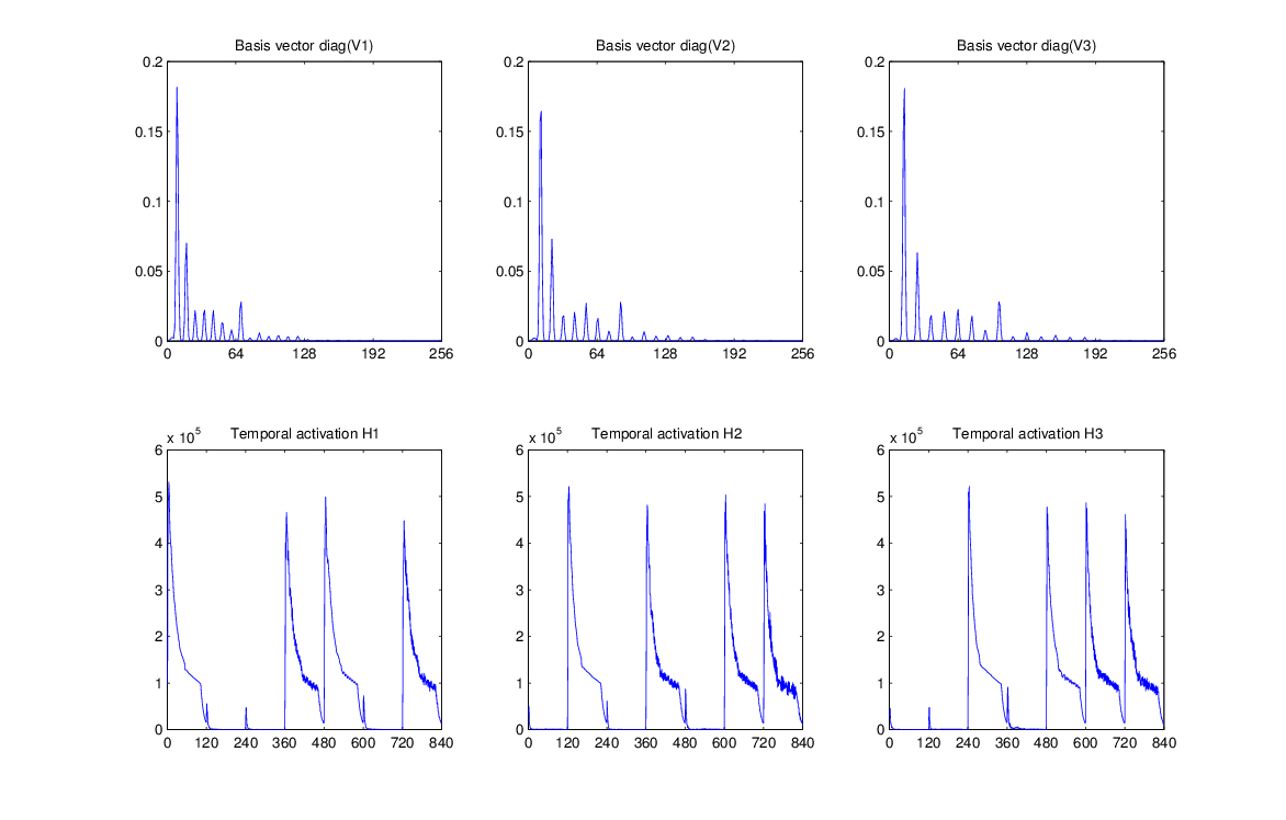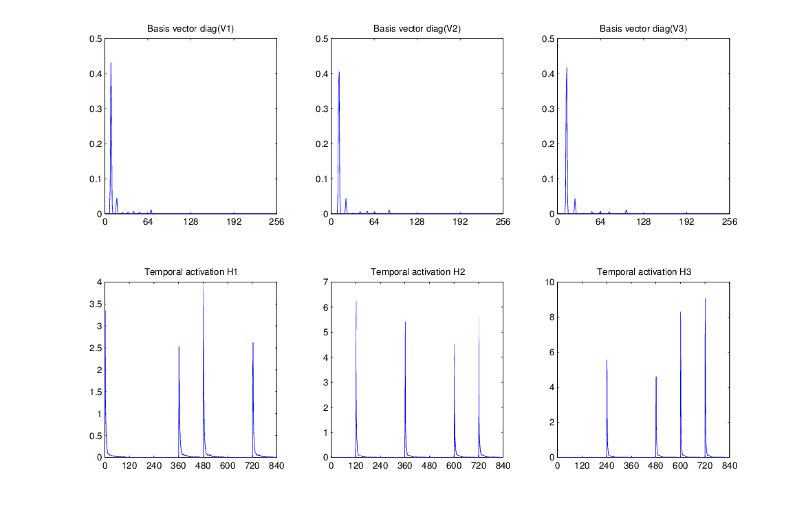 We also tested LD-PSDTF on an audio signal synthesized by MIDI. The total length was 8.4s (N=840). The experimental results showed the overwhelming superiority of LD-PSDTF for source separation. The average SDR, SIR, and SAR were 16.7dB, 21.1dB, and 18.7dB for KL-NMF, 18.9dB, 24.1dB, and 20.5dB for IS-NMF, and 26.7dB, 33.2dB, and 27.8dB for LD-PSDTF. LD-PSDTF works very well for audio signals satisfying the assumption that basis signals are stationary.